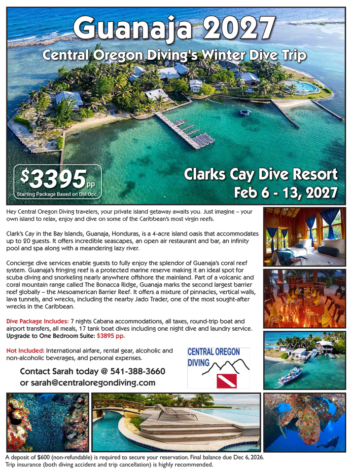 Your private island getaway awaits you with Central Oregon Diving’s winter dive trip to Guanaja. Just imagine—your own island to relax, enjoy, and dive on some of the Caribbean’s most virgin reefs. Guanaja marks the second largest barrier reef globally—the Mesoamerican Barrier Reef—offering a mixture of pinnacles, vertical walls, lava tunnels, and wrecks, including the nearby Jado Trader, one of the most sought-after wrecks in the Caribbean.